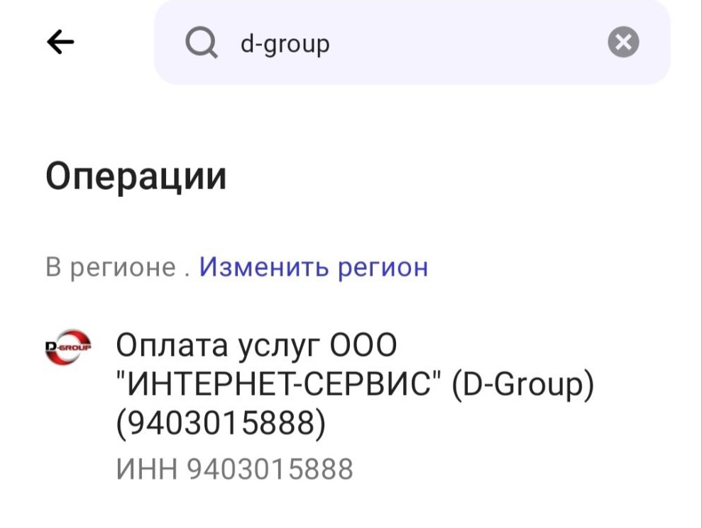 Для оплаты услуги через банковское приложение ПСБ в поисковой строке необходимо ввести D-group или ИНН 9403015888. В банковском приложении СберБанк заходим в Платежи — Каталог, выбираем Интернет, ТВ и телефония, в поиске набираем Интернет-сервис, выбираем ИНТЕРНЕТ-СЕРВИС (D-Group) с логотипом компании, далее в поле «Номер договора» вводим номер лицевого счета и сумму платежа.